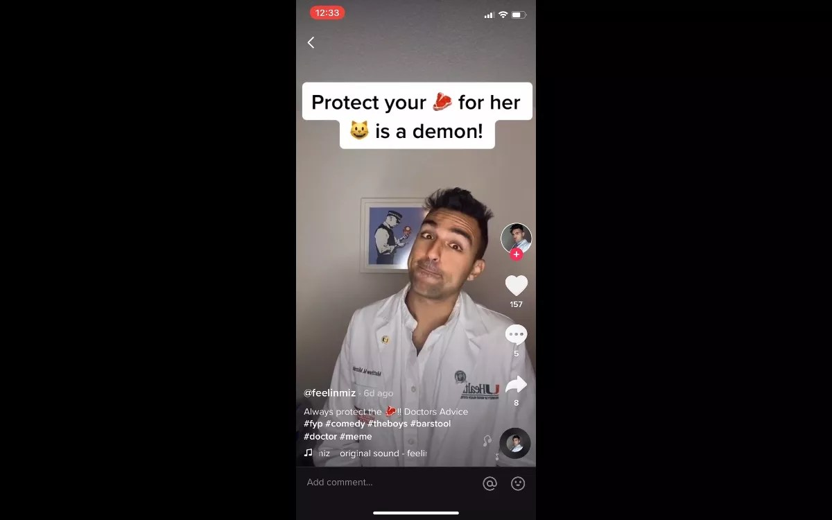 In his bio, Mizrahi invites TikTok users to follow him “for free doctors notes.” But a number of the videos he posts are filled with cringe-worthy “jokes” that rely on misogynistic stereotypes of women. One clip encourages men to “beat your [meat emoji]” before texting a woman because “if you still want to text her… she’s the one.” Another asserts that if a woman “beats your mental but not your [meat emoji]” that “perhaps, she belongs on the street.” In a third, Mizrahi advises that if a woman “argues to get even,” a man should “protect your [meat emoji] for her [cat emoji] is a demon!”