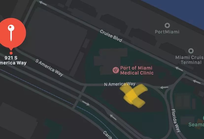 The area marked yellow is the parking lot where Kennedy says he was detained by police. Some distance away, the red pin shows the parking garage where Gov. Ron DeSantis held his press event.