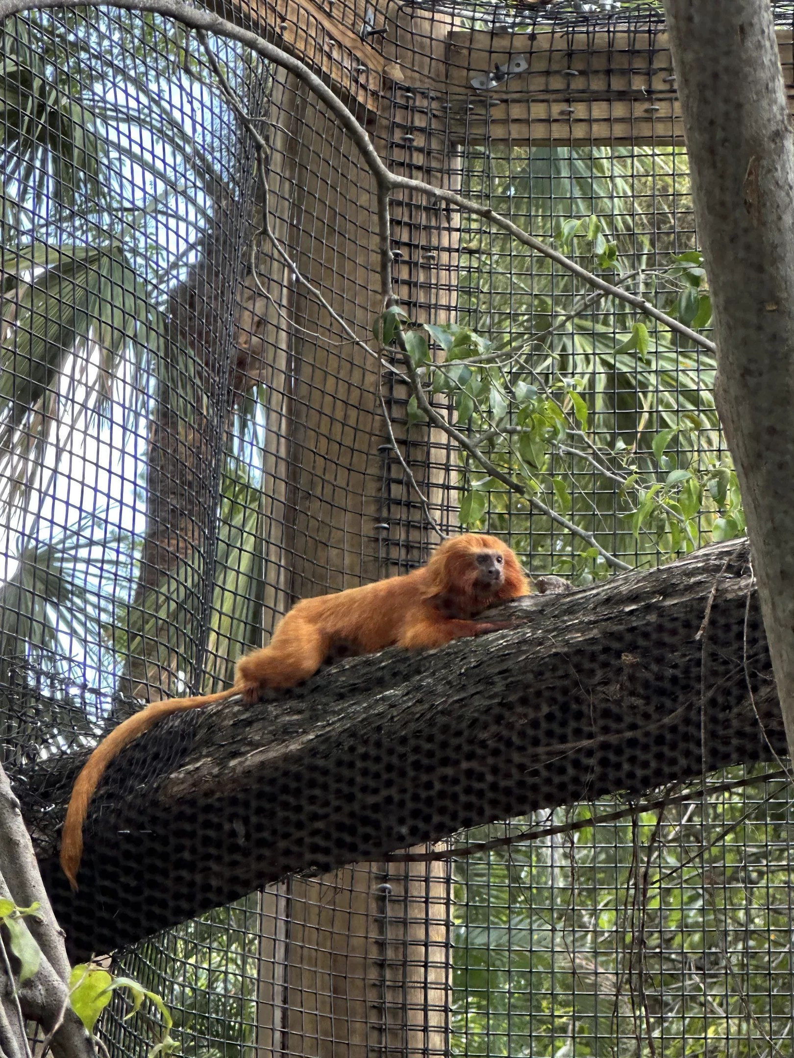 Gabriel, a 14-year-old golden lion tamarin, basks in the South Florida sunlight in his new enclosure at Palm Beach Zoo.