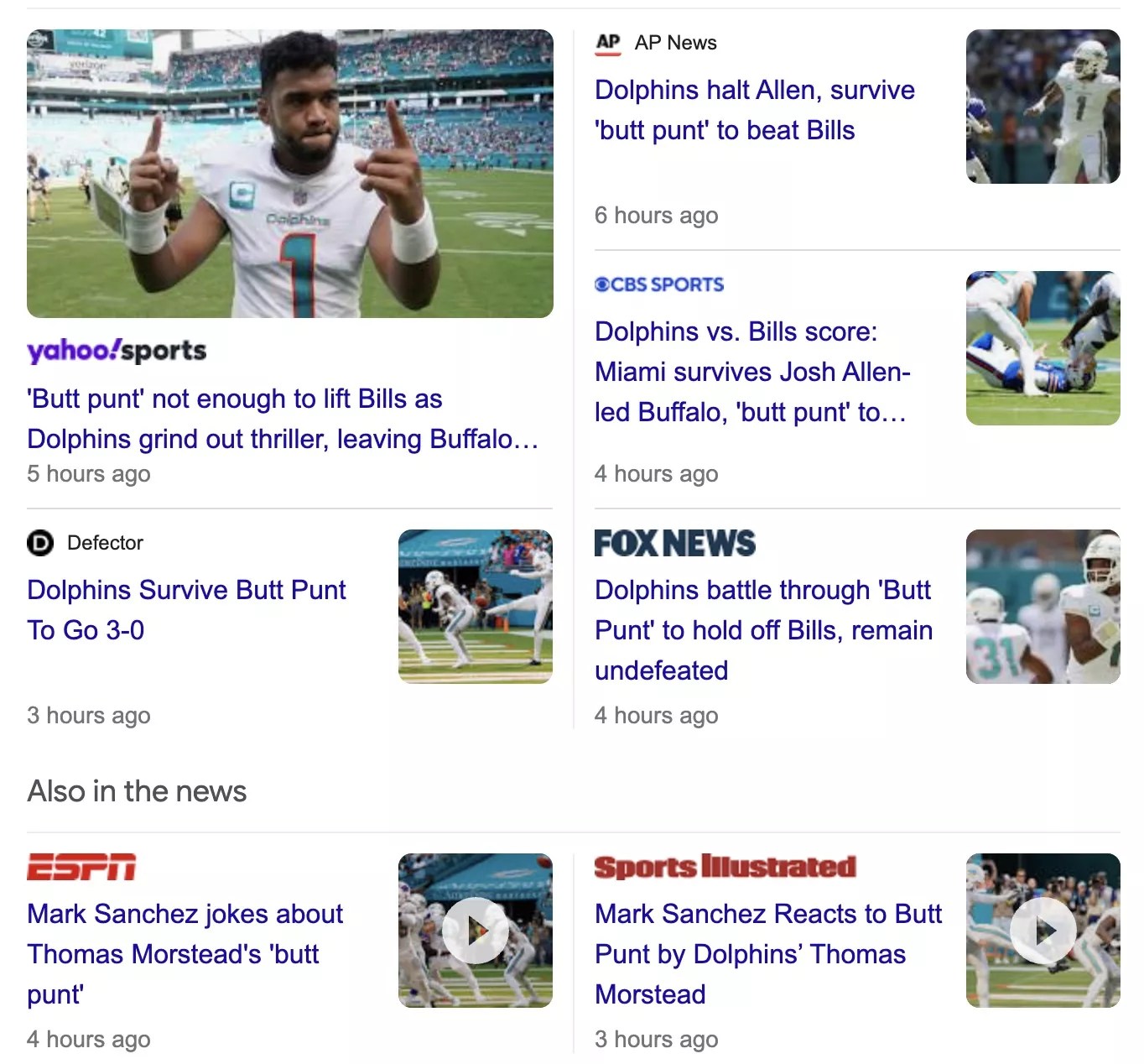 Predictably, the Butt Punt was a huge hit for those covering the game. The Dolphins’ huge win, which put them atop the AFC as the conference’s only remaining undefeated team, was delegated to sidelight of most headlines coming out of the win.