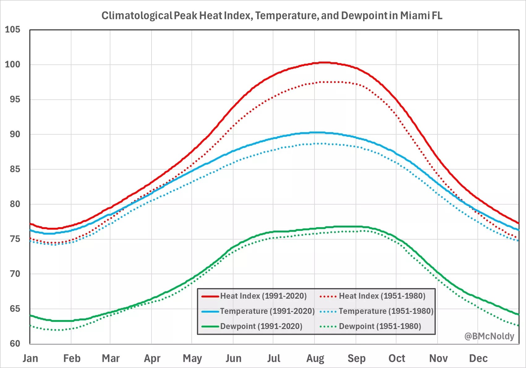 To better illustrate this development, McNoldy made New Times a chart that adds a second set of “climate normal” averages, aggregating the years 1951 to 1980.