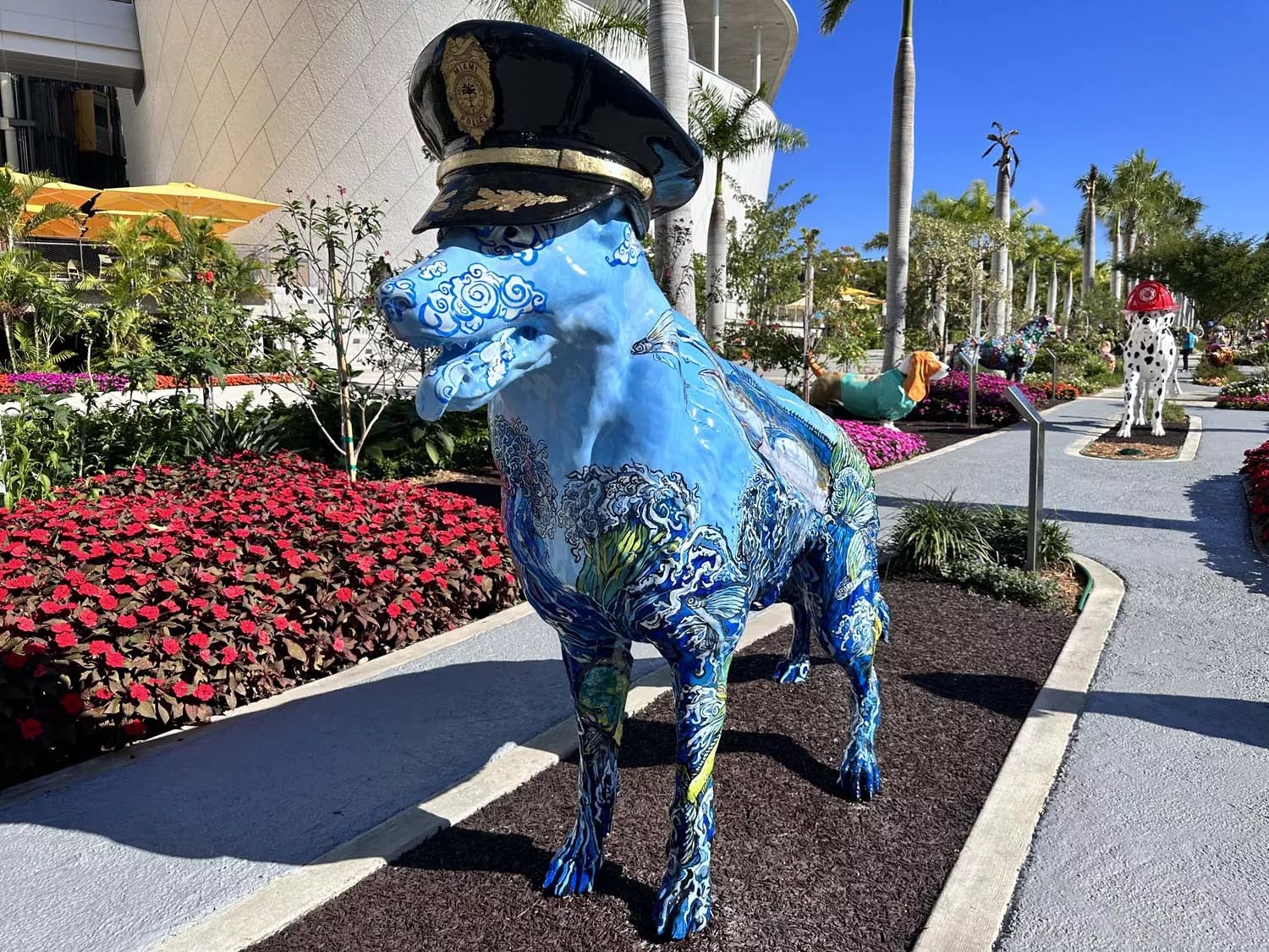 Officially debuting earlier this month, the Dogs and Cats Walkway Sculpture Gardens at Maurice A. Ferré Park consists of 52 aluminum sculptures of various dog and cat breeds painted in bright, garish colors and patterns. There’s a longhaired cat painted in tiger stripes, a poodle with a rainbow dye job, a Chihuahua painted Lisa Frank-pink, and so on. Some pets are wearing clothes. There’s a basset hound in a hoodie, a dalmatian in an oversized fire hat, and most revoltingly, a Labrador retriever in a police cap named the “Boss.”