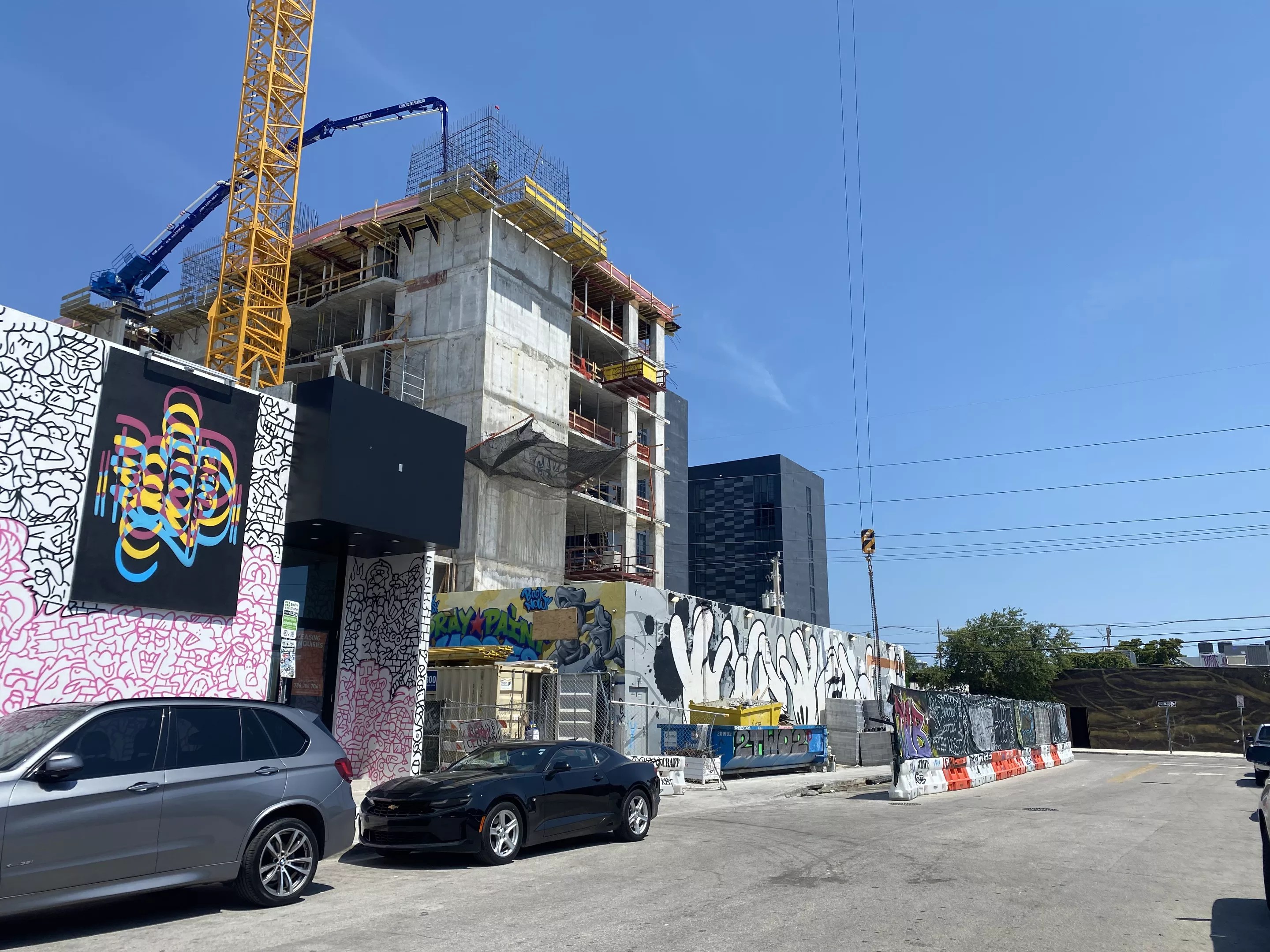 New development blocks the sidewalk, forcing pedestrians into the street, on Northwest Third Avenue.