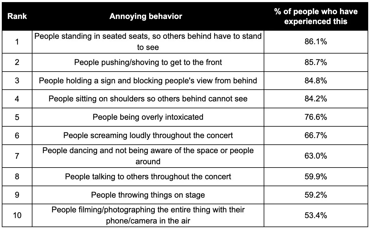However, most of the behaviors Betaway considers “annoying” are pretty much standard concert behavior the world over. In fact, the number-one annoyance for those surveyed was “People standing in seated seats, so others behind have to stand to see.” Um, yeah, that’s called “a concert.” The only shows where I expect a crowd to be seated are boomer-friendly acts or classical performances. Sitting down robs you of the energetic experience of seeing your favorite artist live.