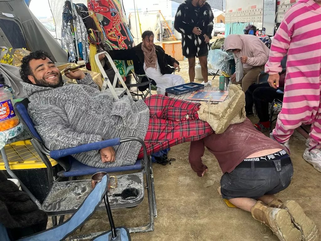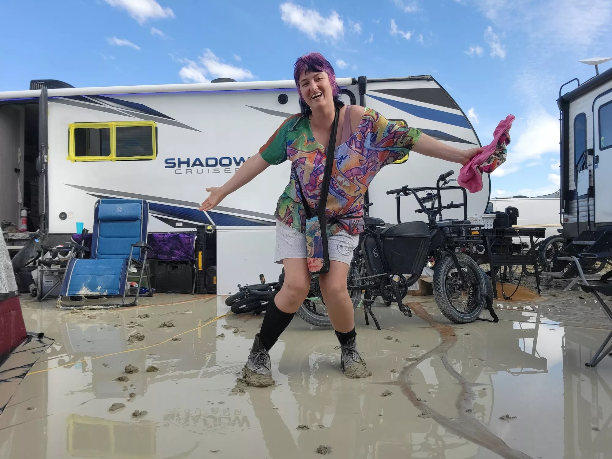 Sure, the streets of the city had turned to a sticky goo no e-bike could traverse. Power had been shut down throughout my camp to ensure no one else got electrocuted. Men started peeing in bottles while folks of all genders relied on self-tended poop buckets. Half the art on the playa was no longer glowing, Diplo and Chris Rock had fled the scene, and word on the street was we might not be able to leave until as early as Tuesday or as late as Thursday.