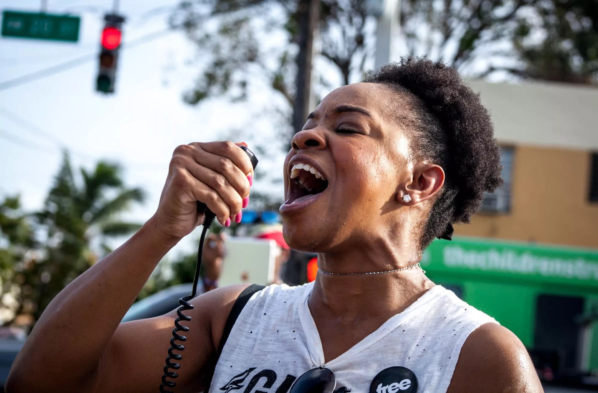 Yonasda Lonewolf, an Oglala Lakota black female activist and organizer, opened the march with a statement and song, although it’s clear to her that we have to go beyond that. For those trying to be better allies, she advises, “Get out of your comfort zone. That means going into a community that you’ve never been to before, sitting and listening. We talk too much, as people. We need to sit and listen and hear what other people’s stories are. It’s kind of like the old ‘get to know your neighbor.’ We have to get back to that. Social media is our new neighbor and who we talk to. We have to get to our neighbor right next door, down the block in Little Haiti, Little Havana. Get uncomfortable.”