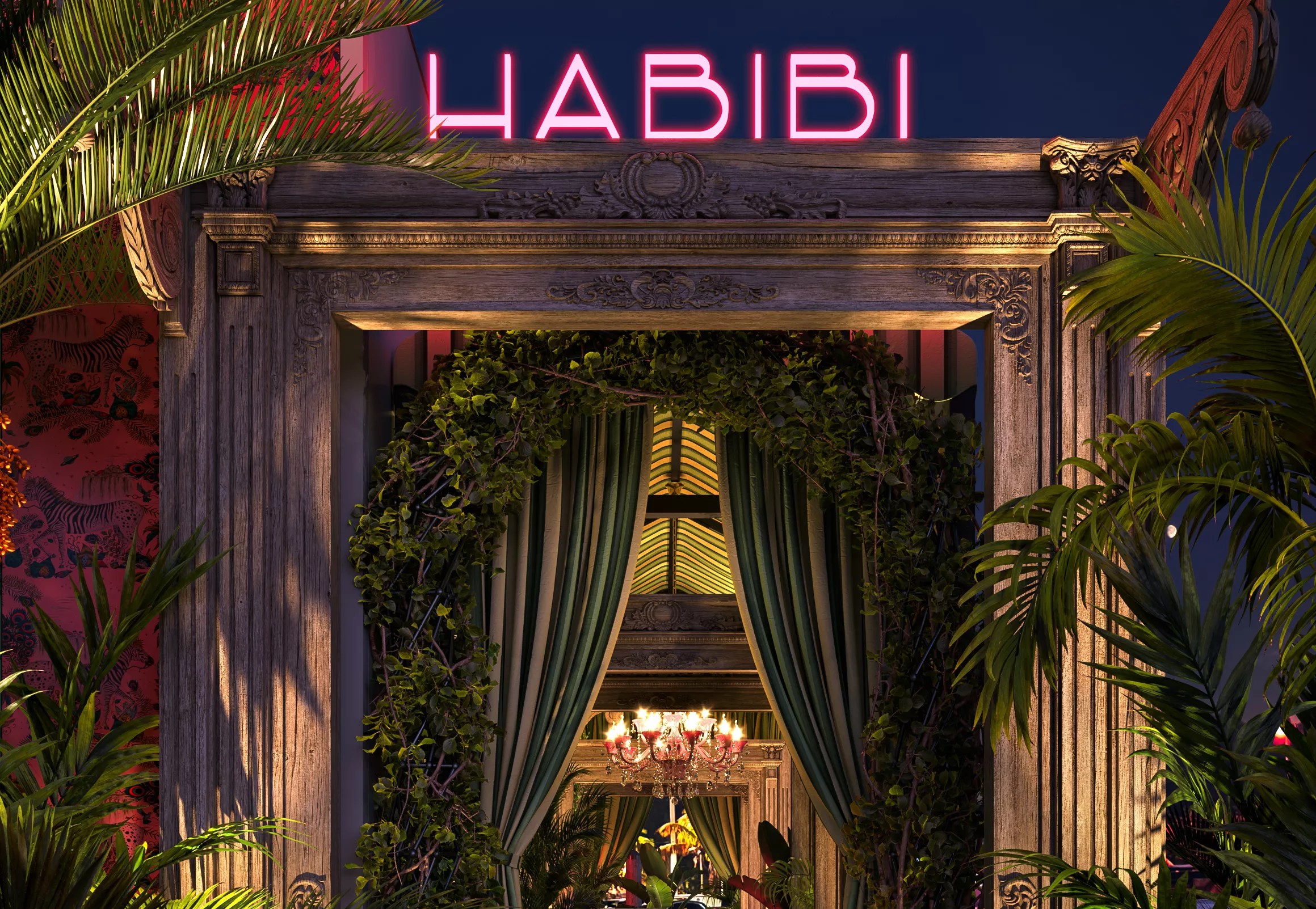 Habibi Miami is designed to replicate Moorish architecture. Inside, guests will find opulent decor like silk draperies and Turkish rugs.