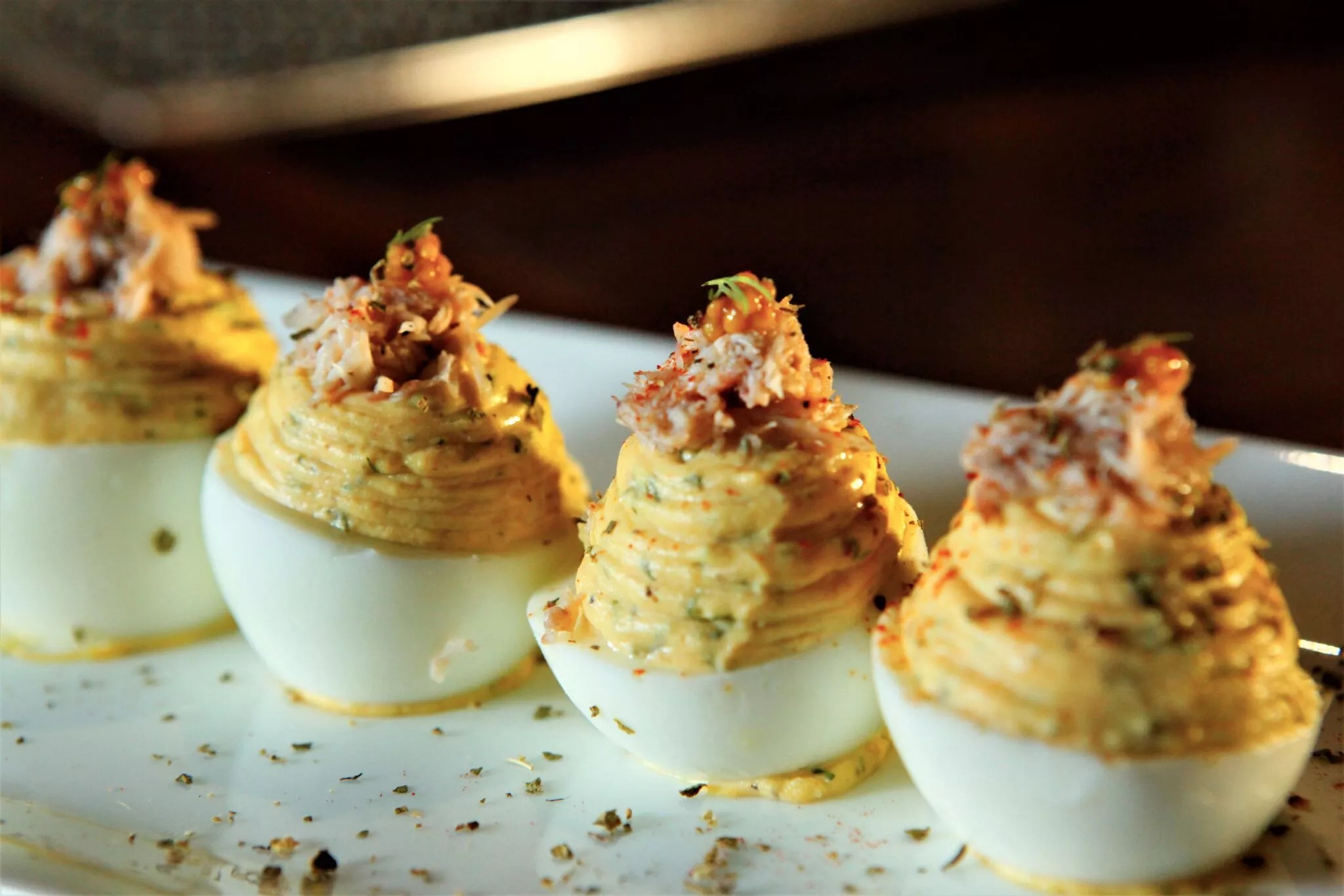 “We always suggest people try the sea-deviled eggs,” Torres says. “They have a nice helping of sweet lump crabmeat that pairs so well with the mustard-seed caviar. It’s different and surprising but still as familiar as a great deviled egg.”