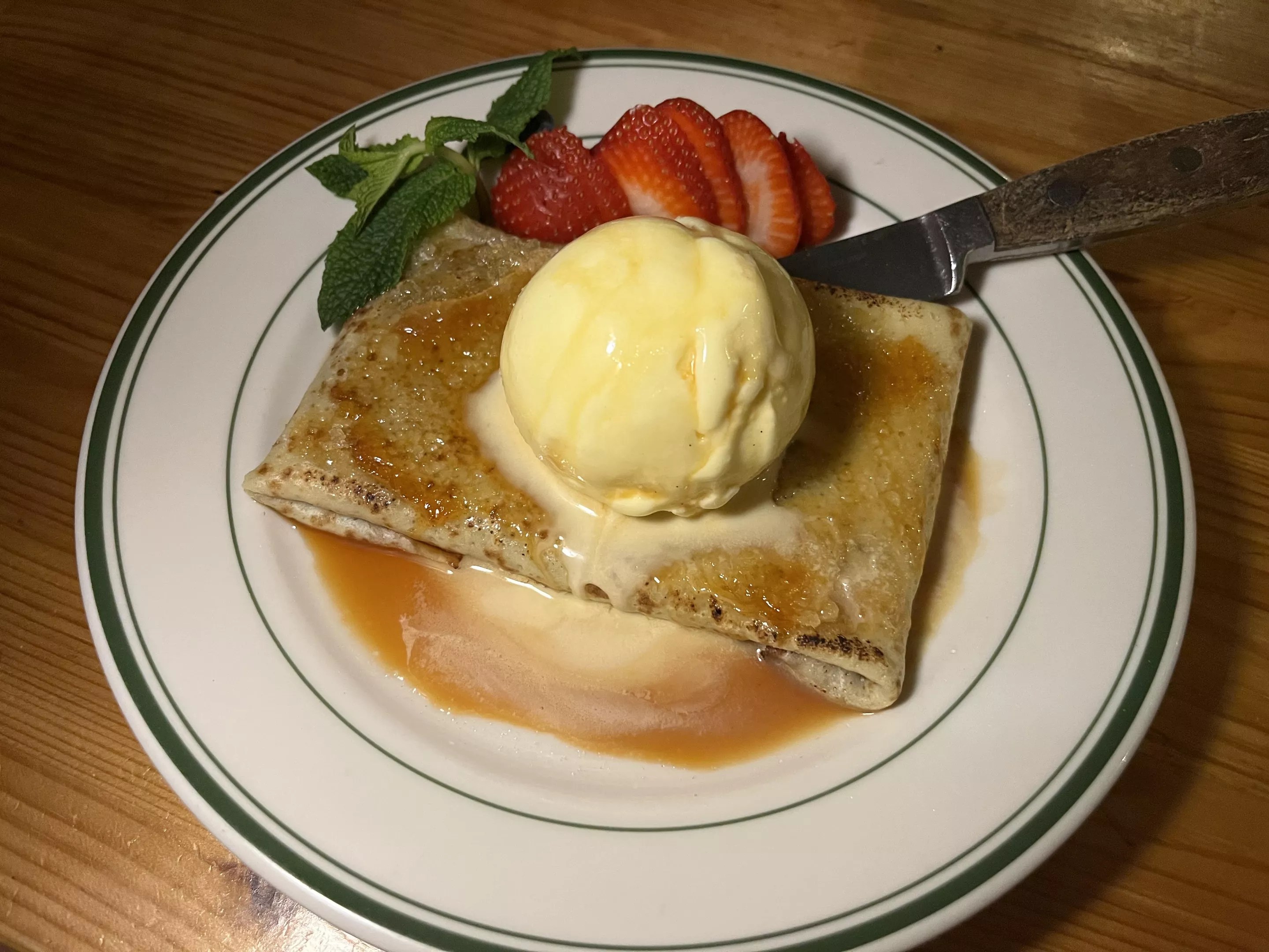 The panqueque with dulce de leche is topped with a crispy layer of caramel and a generous serving of vanilla ice cream.