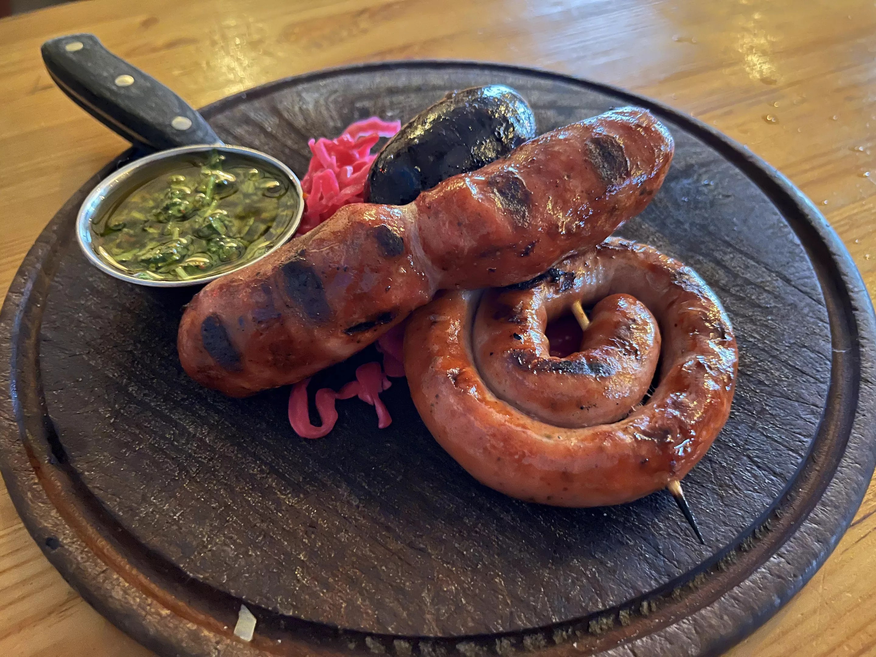 The sausage sampler appetizer consists of a mix of chorizo, morcilla (blood sausage), and “parrillera” sausage, served with a mint-based chimichurri sauce and cabbage salad.