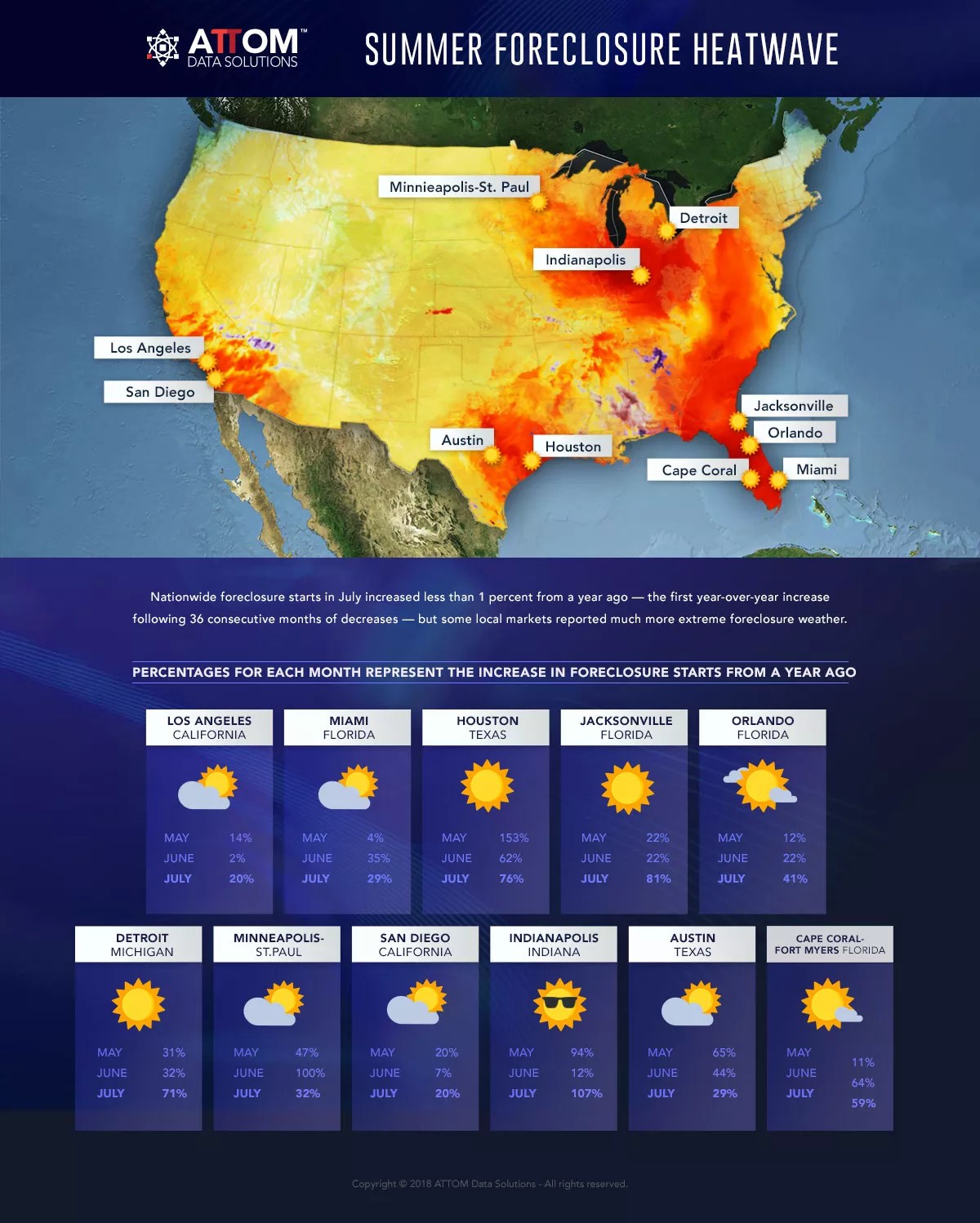 “The increase in foreclosure starts is not just a one-month anomaly in many local markets given that July represented the third consecutive month with a year-over-year increase in 33 metro areas, including Los Angeles, Miami, Houston, Detroit, San Diego, and Austin,” Attom Senior Vice President Daren Blomquist said today in a release. “Gradually loosening lending standards over the past few years have introduced a modicum of risk back into the housing market, and that additional risk is resulting in rising foreclosure starts in a diverse set of markets.”