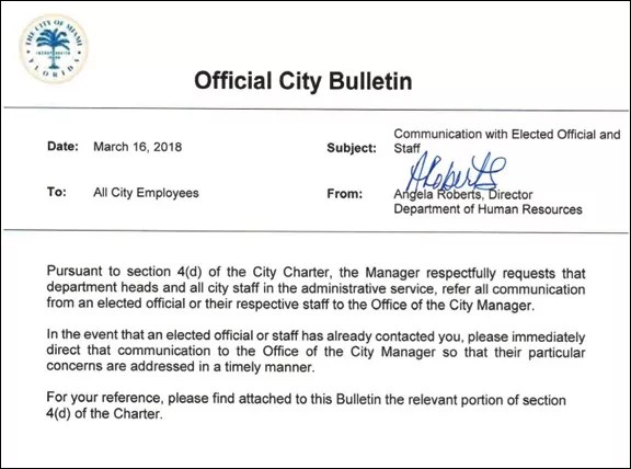 As local blogger Al Crespo first reported, the citywide “bulletin” referenced the exact city charter section, 4(d), which warns commissioners they can be removed from office and even jailed for interfering with the city manager’s employees.